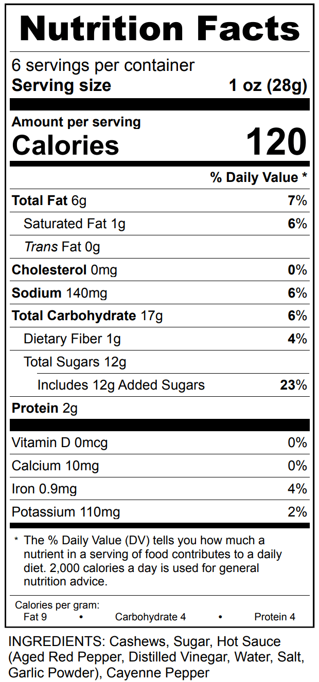Craving something sweet with a little heat? Our Spicy Buffalo Cashews bring the perfect balance of savory, spicy, and sweet for a snack that’s anything but ordinary. Each batch starts with whole dry-roasted cashews, then gets coated in a sweet glaze infused with a mild kick of buffalo spice—delivering a handcrafted treat that wakes up your taste buds and keeps you coming back for more.
