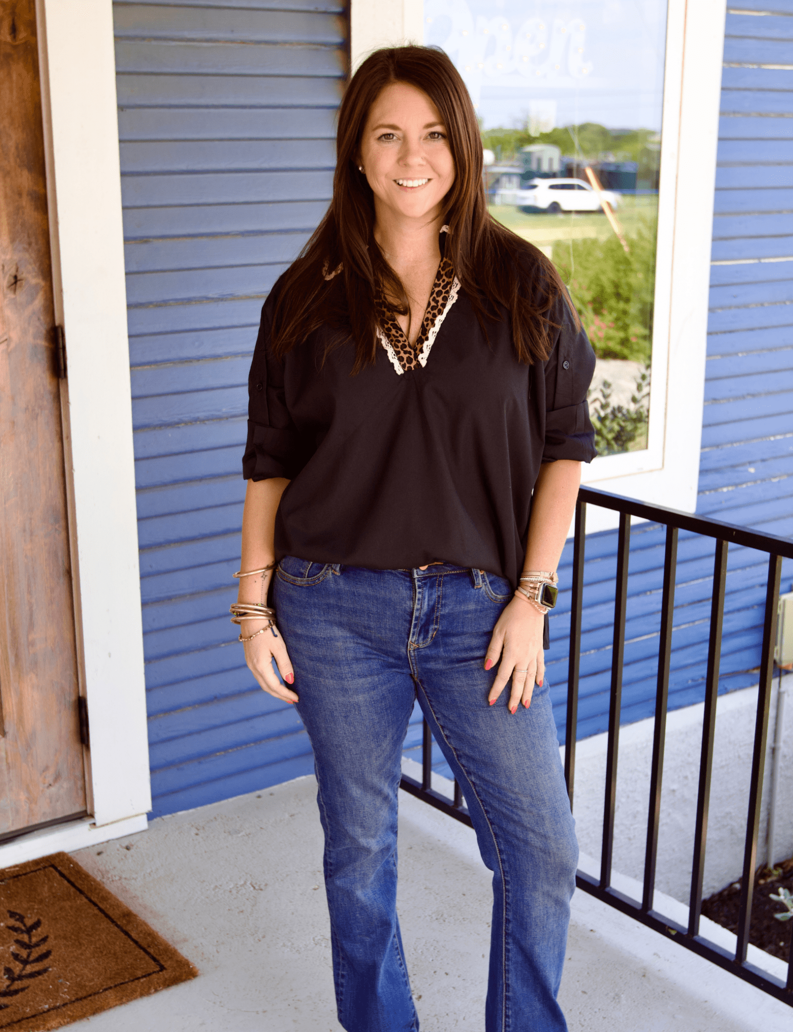 The Rachel Top brings a playful twist to an everyday classic. Featuring ¾ sleeves with button tab details, this woven blouse stands out with contrast leopard print and delicate scallop lace trim along the V-neckline. Lightweight and versatile, it’s the perfect blend of chic and effortless—an instant favorite for every season.